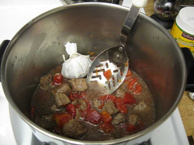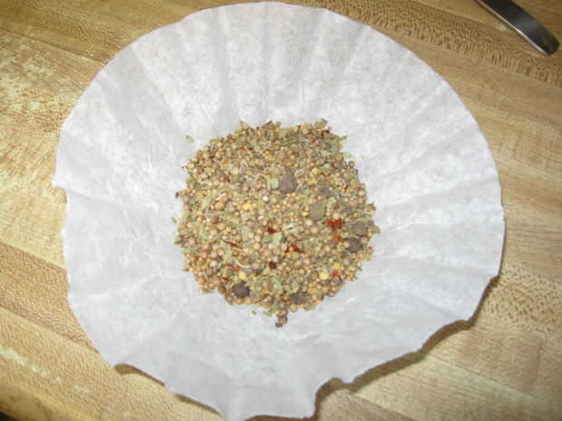 Si vas a usar especias conserva en vinagre, que recomiendo altamente si usted tiene disponible, hacerla en un paquete. Añade un sabor maravilloso, ya que hay muchas cosas buenas en ella, pero es algo desagradable para las piezas grandes cuando usted está tratando de comer el producto terminado. Un té de hojas sueltas de llenar su propia vuelta o algunos estopilla tanto funcionaría bien estoy seguro. Utilicé un filtro de café y algún hilo de cocina.