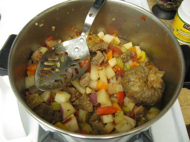 En este lote utilicé 1 corazón de apio small-ish, 6 zanahorias, 2 patatas, 1 pimiento rojo, 1 pimiento amarillo, un nabo muy grande, medio diente de ajo y un batido muy generoso de cebolla picada deshidratada. Chirivías son excelentes si tienes algunas y espinacas (agregado más cerca al final de la cocción) añade algo agradable también.