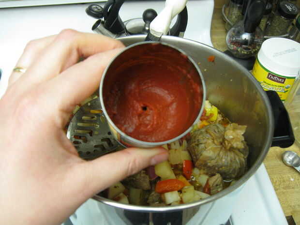 Ahora que tienes todos los ingredientes sólidos en la olla, Sabes cuánto espacio tienes para el agua. Añada suficiente agua completamente cubrir tus vehículos por al menos 1/4 de pulgada y dar todo un buen revuelo.