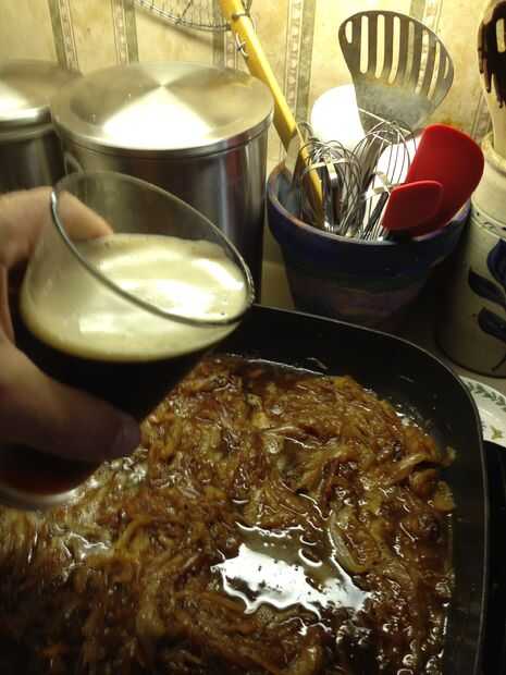 Cuando debían un marrón medio carmelized añadí los líquidos. Arranca el calor hasta 325 hasta que el líquido comienza a hervir.