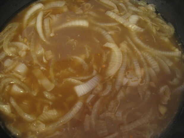 7. Tapar y cocinar a fuego lento durante aproximadamente 20 minutos hasta que el caldo haya espesado ligeramente y las cebollas son muy suaves y tiernos