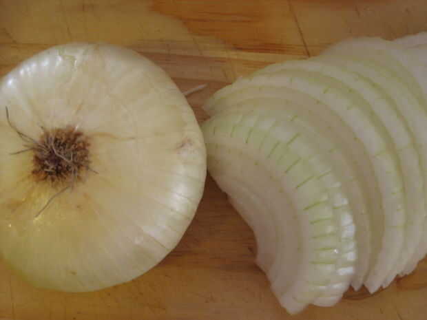 2. Cortar la cebolla por la mitad y cada mitad en rodajas muy finas