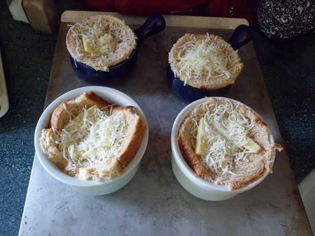Añadir las hojas de pan y queso. Coloque los tazones de fuente en una bandeja para hornear.