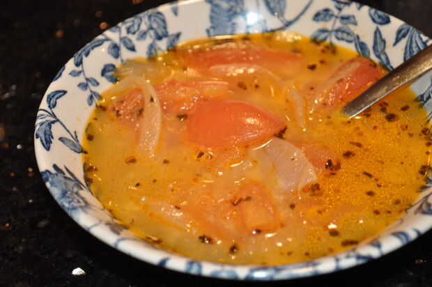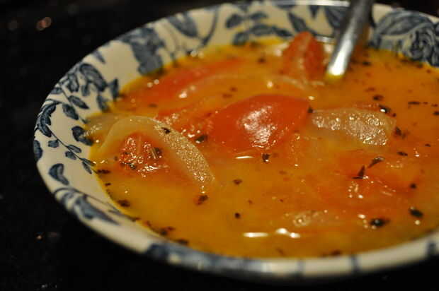 Tomate [4], cebollas [dos pequeños], caldo de res [base], mantequilla, leche, vino cocina, albahaca, orégano, copos de pimiento rojo, sal y pimienta al gusto. MMM. de todos modos.