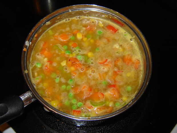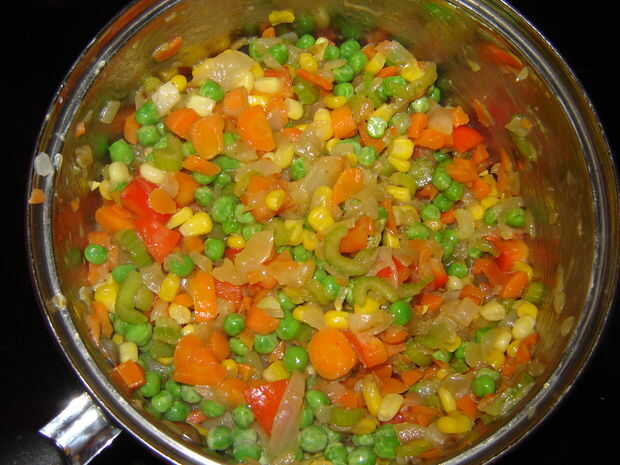 Una vez que las zanahorias y el apio se empiezan a ablandar (tomar unos pedazos hacia fuera, dejan enfriar y el gusto), agregar el maíz, guisantes y pimientos a la mezcla. Después de dos minutos, añadir el caldo y la cerveza.