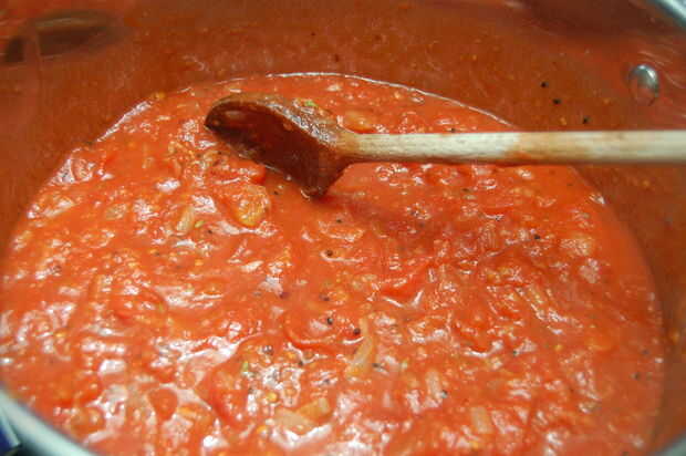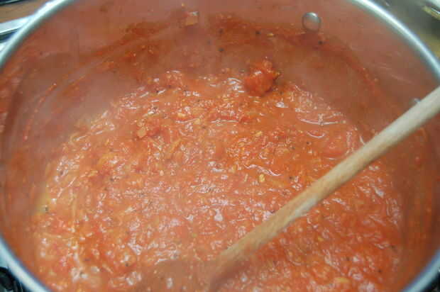 - A continuación añadir los conserva de tomates y cocinar a fuego lento la mezcla a fuego medio durante 10-15 minutos.
