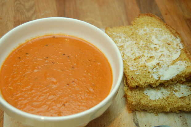 - Añadir una pizca generosa de sal y una cucharadita de azúcar y luego usando un palillo de la licuadora o procesador de alimentos blitz la sopa para hasta que haya quitado los terrones. Esta etapa es opcional pero yo prefiero una sopa de tomate suave.