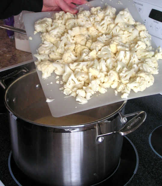 Añadir la coliflor y calor a ebullición sobre alto calor. Reducir el fuego a bajo; Cubra y cocine a fuego lento hasta que la coliflor esté tierna, unos 15 minutos.