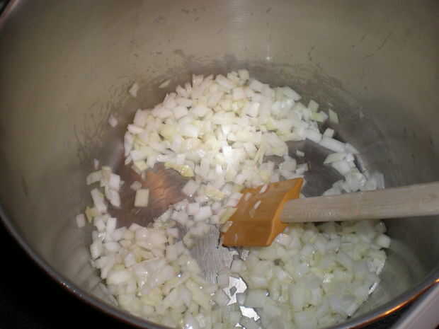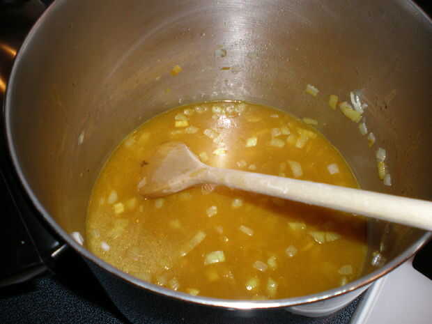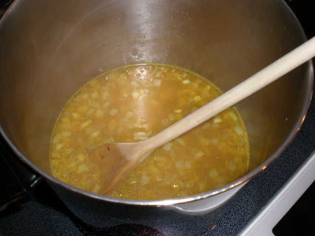 Revuelva mientras que las cebollas comiencen a ablandar y vuelta translúcido. al llegar a este punto, añadir las especias, revuelva la cebolla una vez y luego agregar el caldo de verduras. (después de las especias ayuda a mezclar, en lugar de formando molestosas flotantes islas de las especias, añadir el caldo de verduras).