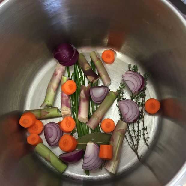 Poner la cebolla, zanahoria y extremos leñosas de los espárragos en una sartén con el vino, tallos de perejil, tomillo, laurel, sal y pimienta. Agregar agua caliente para cubrir verduras, luego cocine durante 30 minutos (o presión a cocinar durante 10 minutos). Colar y descartar los sólidos.