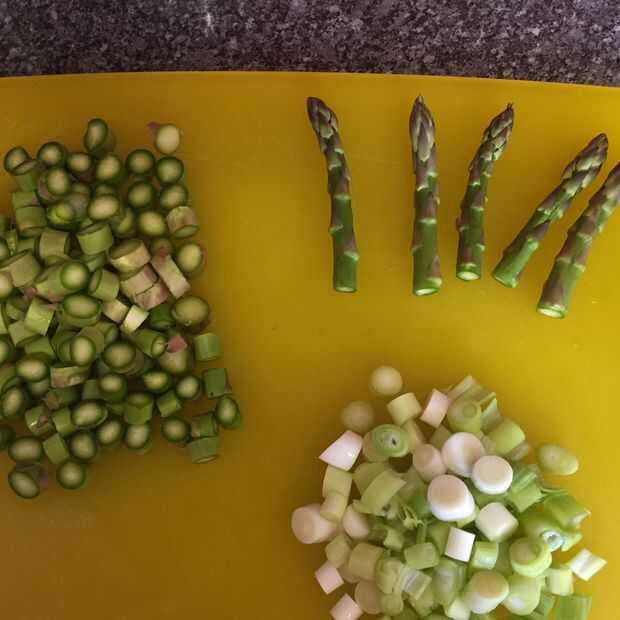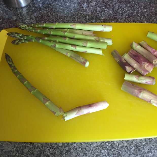 Quite los extremos leñosos de los espárragos. Cortar las puntas de los espárragos. Cortar los tallos.