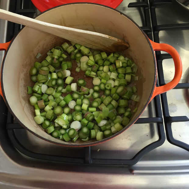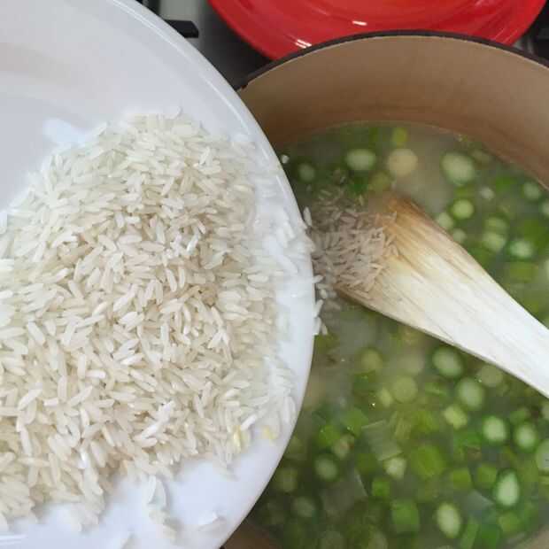 En la misma sartén, saltear espárragos en rodajas las cebolletas en rodajas tallos por 5 minutos. Añadir el caldo, arroz y leche. Añadir perejil o cebollino. Cocinar durante 20 minutos.