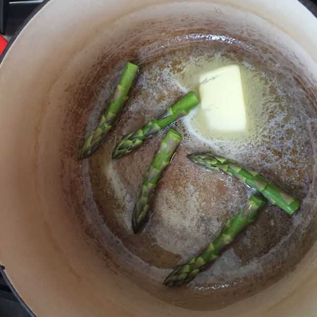 Derretir la mantequilla en una cacerola, saltear los espárragos consejos suavemente durante 5 minutos, luego retire y guarde para la guarnición de la sopa.