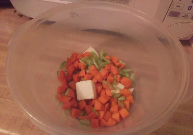 Combinar el apio y las zanahorias y la mantequilla a su tazón de fuente grande. Cubra ligeramente y cocine durante 6 minutos.