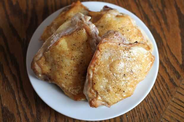 Que estos cocinar por unos minutos o hasta que usted puede oler la piel de pollo cocina y puede mover los muslos - así sabes que no son sujetadas al fondo de la cacerola ya! Voltearlas y cocinar del otro lado por un minuto o así y entonces transfiera a un plato limpio. Repita con los otros muslos.