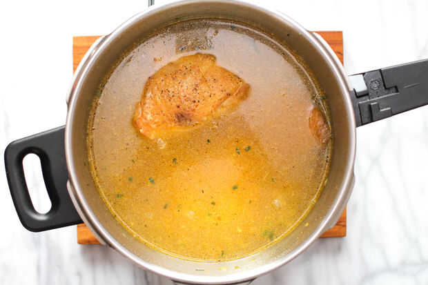 Agregar las cuatro tazas de caldo y cuatro tazas de agua. Revuélvalo juntos.