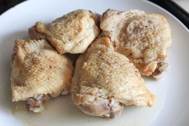 Una vez que la presión ha aparecido naturalmente, abrir la olla a presión y retire los muslos de pollo. Establece el aparte en un plato grande para triturar.