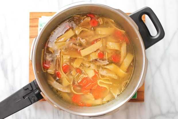 Ahora añades los fideos! Vuelva a colocar la olla en el calor y hacerlo burbujear otra vez. Mezclar en dos puñados (tal vez 1 taza?) de fideos y cocine según las instrucciones del envase. Sé que suena un par de puñados como nada, pero esto es un poquito de sopa! Si agrega demasiados fideos va absorber todo el caldo.