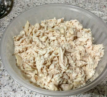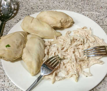 Con el alambique de caldo hirviendo, tomar 2 tenedores y empezar a desmenuzar las pechugas de pollo apartes utilizando un tenedor para sostener el pecho hacia abajo mientras usa la otra horquilla que raspe las fibras del músculo fibrosas. Podría cortar el pollo en trozos, pero he encontrado que pollo desmenuzado funciona mejor para la sopa.