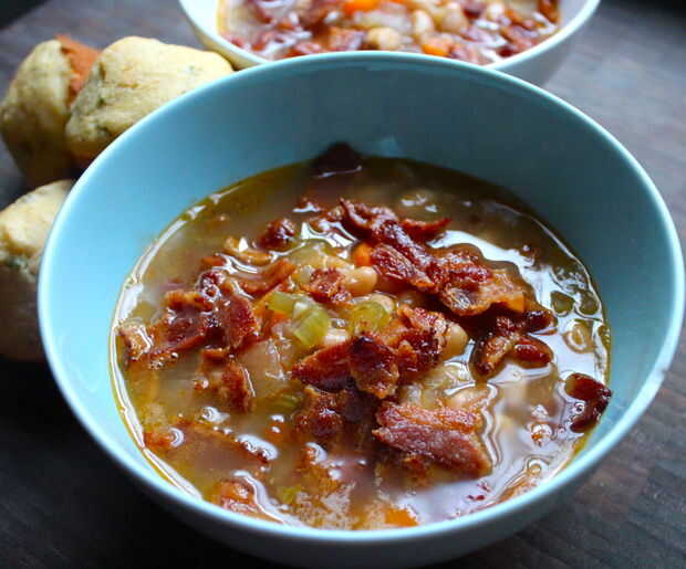 También puede cambiar a las verduras con tus favoritos o añadir más. Estará haciendo esta sopa de alubias blancas en una olla a presión, pero usted puede hacer en la cocina también! Bacon es opcional pero impresionante y hace más relleno. También puede usar jamón o pollo.