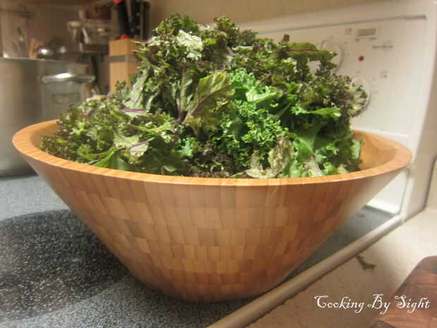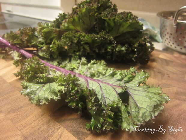 Dos racimos de kale parece mucho cuando lo despalilla corte para arriba, pero creedme, se cocinarán abajo bien cuando agregarlo a los frijoles.