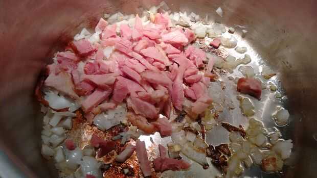 Saltear la cebolla picada, añadir el jamón y mezclar a fuego bajo.