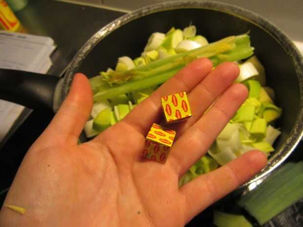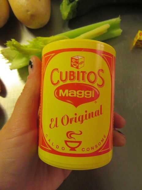Cuando se cortan todas las verduras y en la olla, añadir dos cubitos de Maggi.