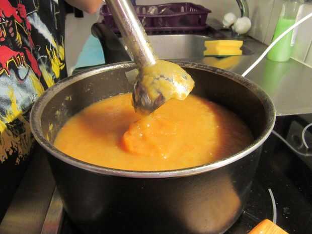 esto es una sopa deliciosa, especialmente para el otoño! realmente, realmente, es dos sopas, mezclados en uno. dulce y tostado, con un poco de calor dulce para poner encima de una muesca.Rinde aproximadamente 3 tazas de cada sopa, servir 6Paso 1: Reu