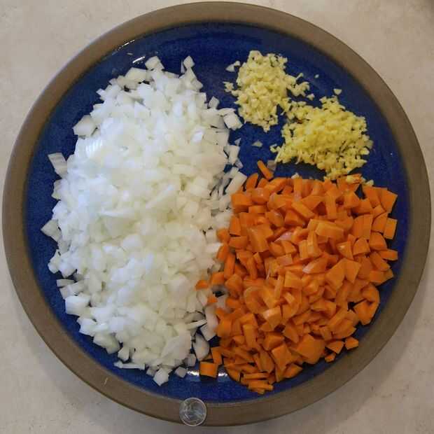 Dados las cebollas y las zanahorias en 1/4" piezas que mezcla con las lentejas cuando se cocina. Picar el ajo y el jengibre.