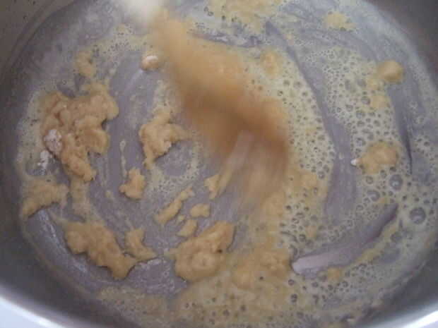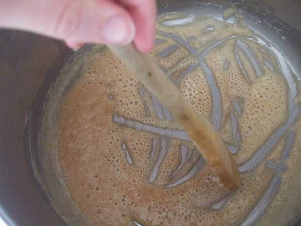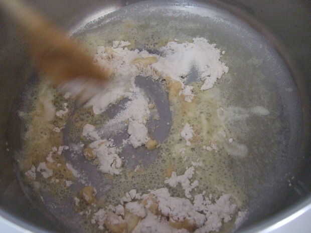 Una vez que la mantequilla se haya derretido, añadir la harina y empezar a revolver. La harina absorberá la mantequilla y convertir en una pasta blanca. Continuar revolviendo (usted puede reducir la velocidad en este punto, pero no se detienen) hasta que empieza a oler un poco chiflado y cambia de blanco a crema a rojo-de oro. Roux es la palabra francesa para este color negro-rojo-de oro, así como la sustancia mágica que acaban de producir.