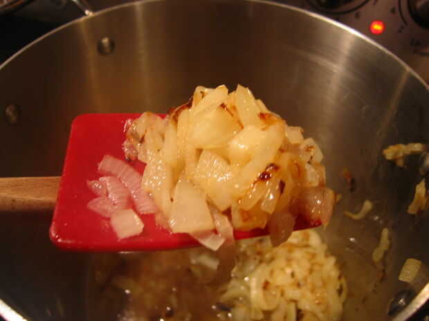 Rehogar la cebolla en el aceite hasta los bordes marrones. Añadir el ajo y sofría hasta que apenas empiece a dorarse.