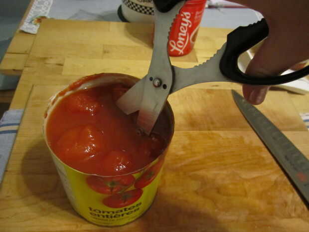En una jarra de medición grande, mezclar el caldo, si lo que hace de polvo. Añadir la pasta de tomate. Abrir los tomates enlatados y picar para arriba con un par de tijeras de cocina (Tip: esta es la manera más fácil y más limpia para cortar tomates en conserva).