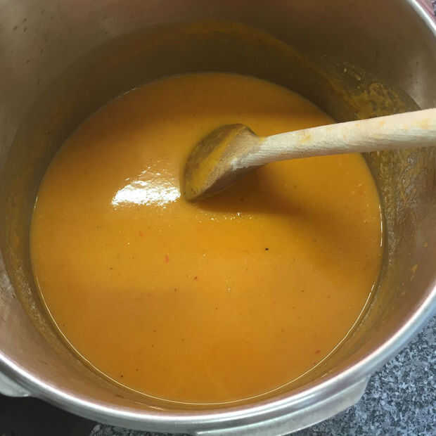 Usar una licuadora de palillo para mezclar la sopa hasta que quede suave. ¿Ajuste los condimentos - sal, pimienta, jugo de limón, azúcar?