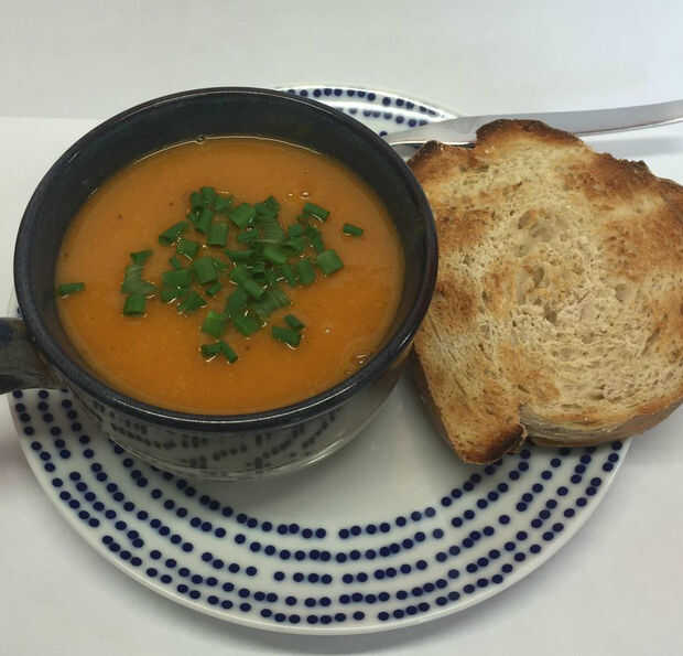 Recalentar la sopa y la cuchara en tazones. Decorar con hierbas picadas, como cebollino o perejil y sirva con pan crujiente o tostado.