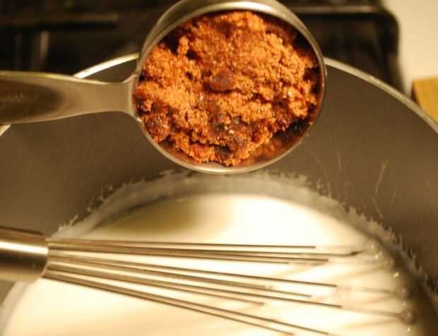 2. Calentar leche de coco en la cacerola y llevar a fuego lento, removiendo de vez en cuando (Nota: Bata más o menos continuamente durante todos los pasos)