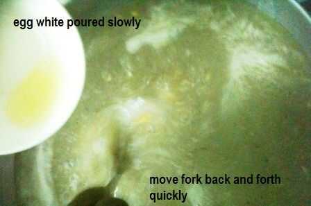 Cuando la sopa viene al punto de ebullición y las burbujas al centro... poco a poco verter la clara del huevo y al mismo tiempo rápidamente mueva la horquilla hacia adelante y hacia atrás en la sopa... Esto formará el hilo de la clara de huevo.