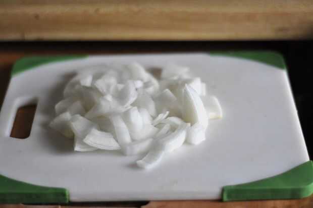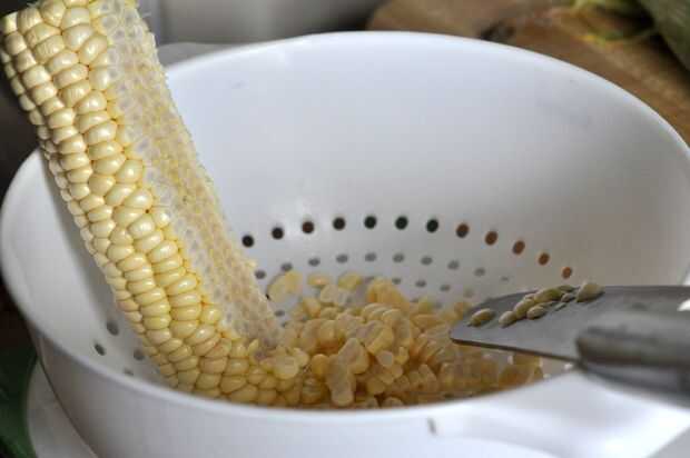 4. Añadir el caldo vegetal, removiendo enérgicamente. Cocinar a fuego lento durante 10 minutos. Mientras están hirviendo las otras verduras, puede preparar el maíz por valvas y quitar los granos de la mazorca. Me gusta cortar el kernals de maíz directamente en un colador de manera que puedo enjuagar fácilmente.