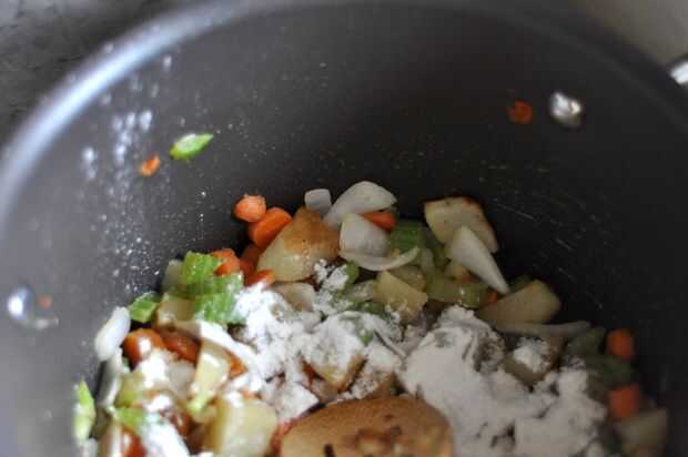 3. Espolvoree la harina sobre los vegetales y mezclar muy bien. Cocine por otros 5-10 minutos.