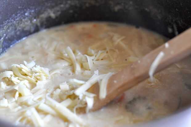 2. retirar del fuego y añadir lentamente en el vino, mitad y mitad y cheddar. Volver al calor y dejar cocer a fuego lento durante otros 5 minutos.