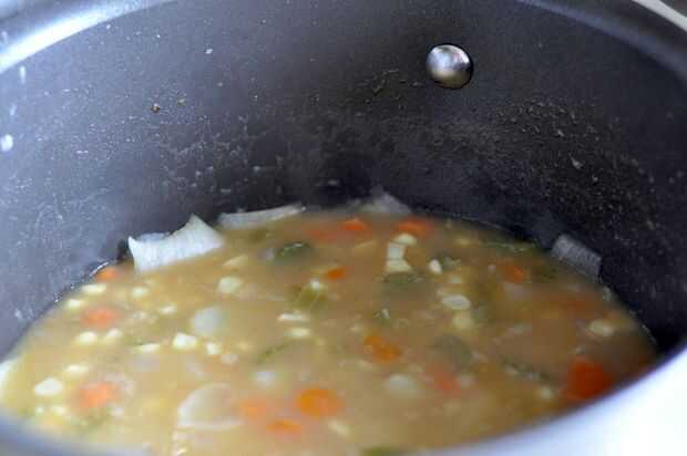 1. una vez que las patatas y otras verduras están cerca de tierno, añadir los granos de maíz y tomillo. Cocinar a fuego lento durante 15-20 minutos.