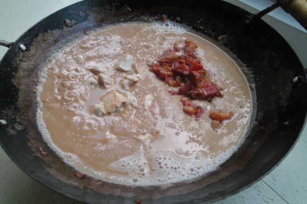 Añadir la carne salada, los filetes de pollo doradas, los tomates y la cebolla.