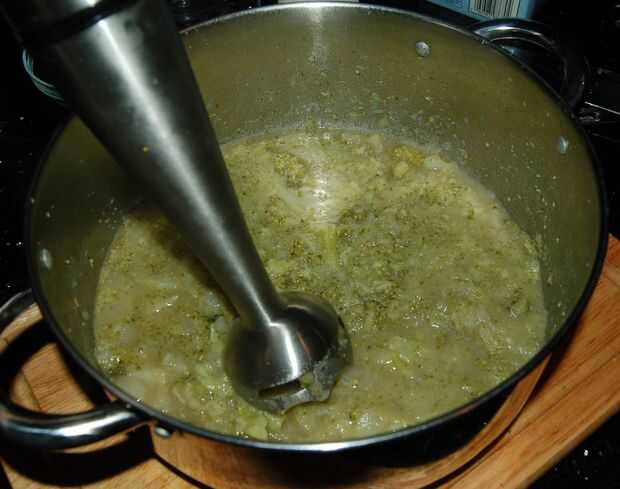 Puré la sopa, por lotes, utilice una licuadora de inmersión (palillo) en la olla a la consistencia deseada.