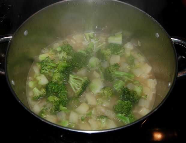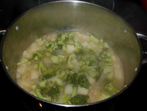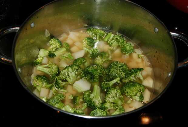 Añadir el brócoli, caldo de pollo y Papa a la olla y subir el calor a medio-alto.