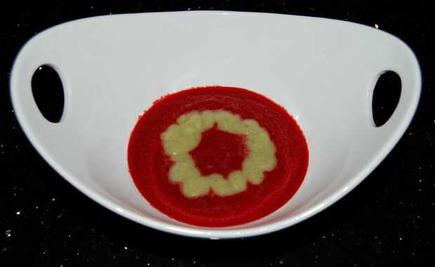 Para la diversión que podría hacer cuencos alternando para cada huésped una con una corona roja de base y verde el siguiente lo contrario: verde sopa con una guirnalda roja.