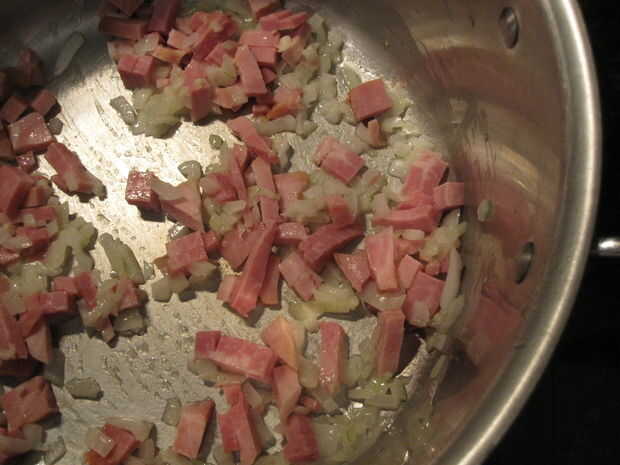 Caliente el aceite o la mantequilla en una olla grande.  Añadir las cebollas y cocine hasta que estén tiernos.  Agregue el ajo y cocinar para una adición de 2 minutos.  Añadir el jamón y cocine durante 2-3 minutos.  Agregar los tomates, dos latas de frijoles y sus jugos, caldo y comino.  Llevar a fuego lento.