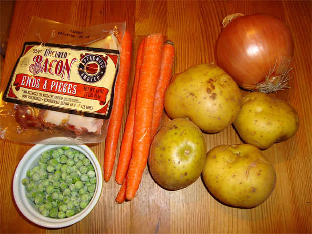 esta deliciosa sopa es grueso y abundante, con muchos vegetales y la bondad de tocino!Paso 1: Reunir los ingredientes Se reúnen los ingredientes:4 tiras de bacon (preferiblemente grueso corte)2 papas medianas de teja2 tallos de apio4 zanahorias1/2 ce