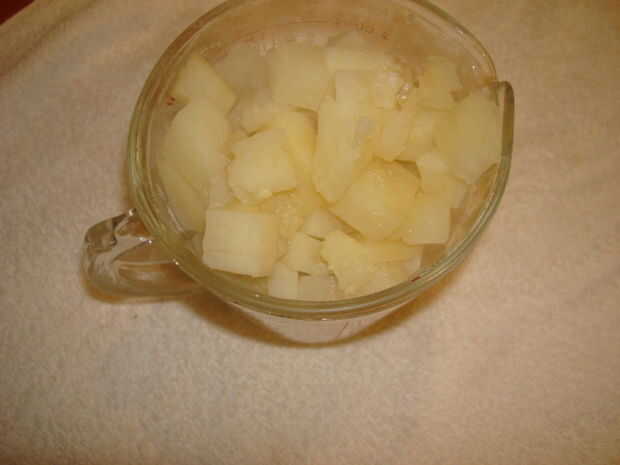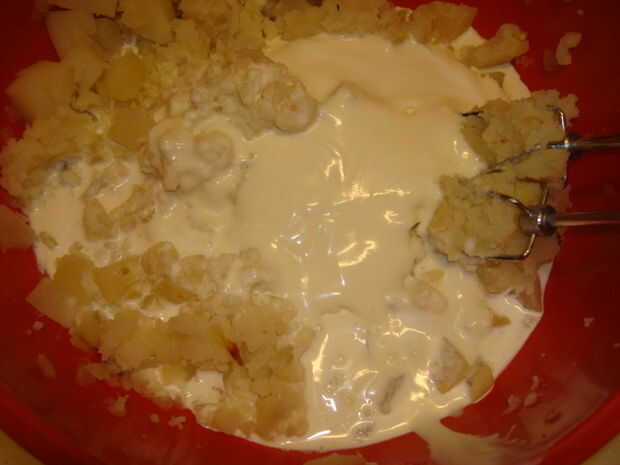 Vierta de patata en un recipiente mezcla o un procesador de alimentos (reserva 2 tazas para una sopa gruesa si lo desea) y mezclar bien.