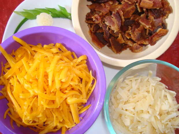 Decorar con cebolla, bacon, cheddar y parmesano.