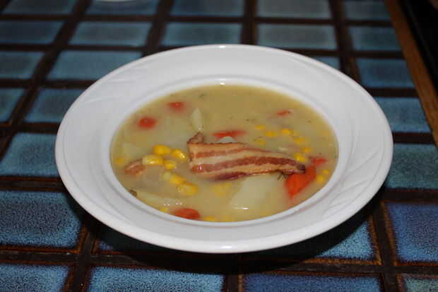 Comida: 6 tiras de tocino, 2 latas de crema de pollo sopa, 6 tazas de agua, 8 papas grandes, cebolla pequeña, 4 zanahorias, perejil, sal y pimienta, 1/2 taza de queso cheddar y una bolsa de maíz.