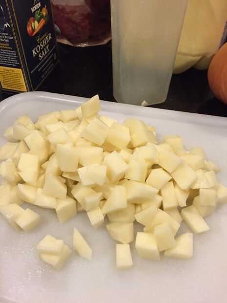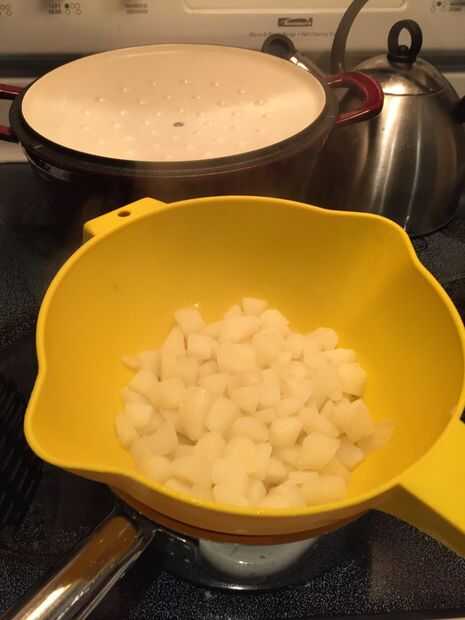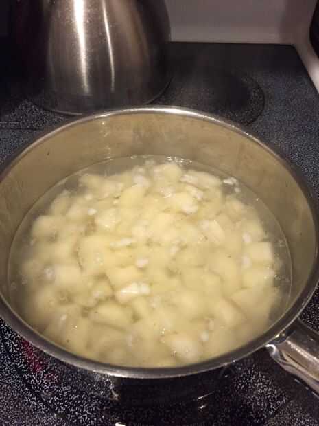 Cortar la patata en trozos pequeños y cocinar en agua hirviendo, asegúrese de que añadir sal al agua. Mientras que se cocina, picar la cebolla. Sólo tuve una cebolla grande así que voy a guardar algunas de mi cebolla para más adelante. Cuando las papas estén suaves pero no blandos drenar el agua de las patatas. Guardar las patatas en el colador y volver a la olla a la estufa.